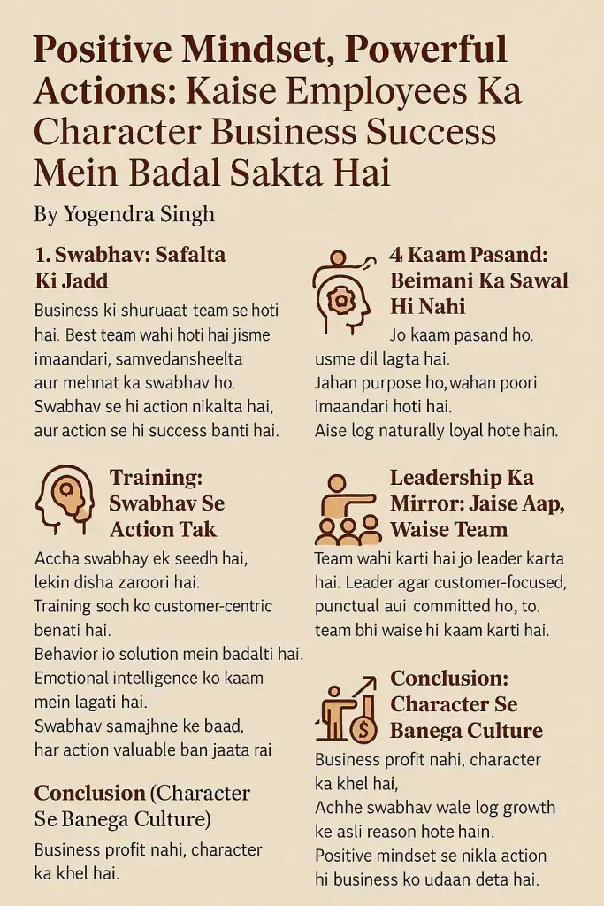 एक बिज़नेस की असली ताकत उसके लोगों के चरित्र में होती है। जब लीडर अपने कर्मचारियों को इंसान की तरह समझता है, training देता है और विश्वास करता है — तब वही टीम बिज़नेस को सफलता, स्थिरता और सम्मान की ऊँचाई पर ले जाती है। चरित्र ही संस्कृति बनाता है।